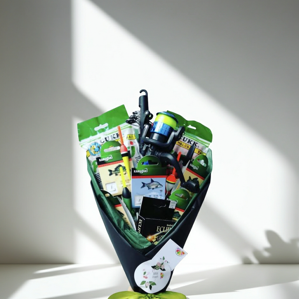 Buchet format din undita + mulineta, ace de diferite dimensiuni, plute de diferite dimensiuni, bambine, fir pentru pescuit si momeli metalice colorate. Numarul produselor pot sa difere, in functie de constructia buchetului.