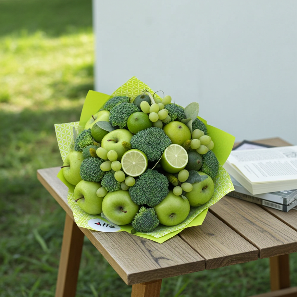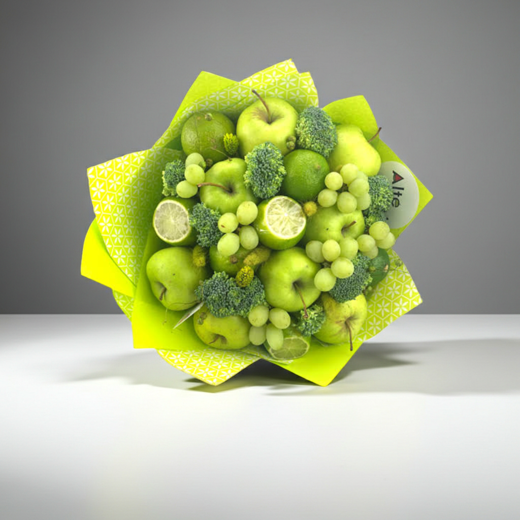 Buchet format din mere verzi, lime, brocoli, struguri verzi si flori sau detalii uscate.